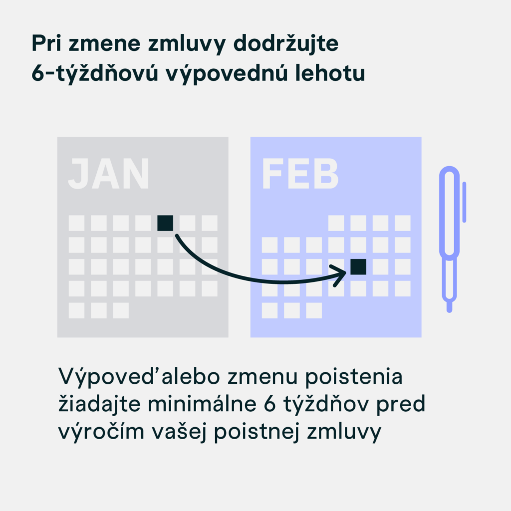 Poisťovňa vám zo zákona musí poslať predpis dva mesiace pred výročím vašej zmluvy. Vo vašom prípade to znamená, že máte dostatok času na to, aby ste si skontrolovali cenu vášho PZP na ďalšie poistné obdobie. Ak je cena vo vašom prípade nižšia, je potrebné poslať do vašej poisťovne výpoveď šesť týždňov pred výročím zmluvy.