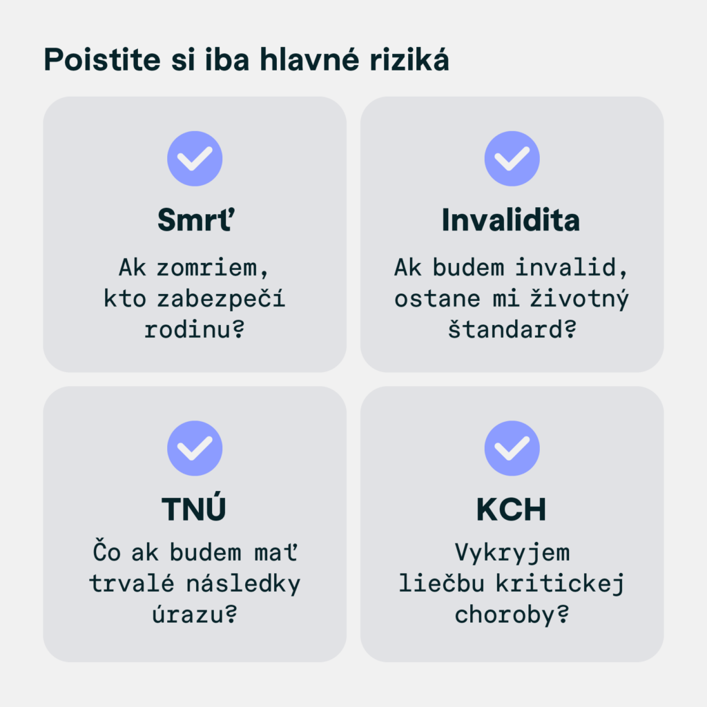 Hlavným účelom životného poistenia je chrániť vás a vašu rodinu pred finančnými stratami v prípade nepredvídaných udalostí. Rizikové životné poistenie preto vnímame ako najvýhodnejšiu voľbu. Tento typ poistenia neobsahuje sporiacu zložku, celkové poistné je spotrebované na poistné riziko. Rizikové poistenie poskytuje ochranu pred rizikami spojenými s chorobami, úrazmi a smrťou z akýchkoľvek príčin, vrátane civilizačných ochorení. Jeho hlavnou výhodou sú nižšie celkové náklady, keďže odpadajú náklady spojené so sporením. To z neho robí cenovo dostupnejšie, flexibilnejšie a transparentnejšie riešenie.
