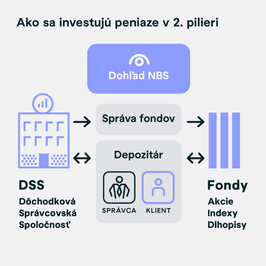 Druhý pilier funguje tak, že časť povinných odvodov, ktoré by normálne išli do Sociálnej poisťovne, sa preposiela na váš osobný účet sporiteľa v Dôchodkovej správcovskej spoločnosti, s ktorou máte uzatvorenú zmluvu. Príspevky sa následne investujú s cieľom zhodnotiť úspory a zabezpečiť lepší dôchodok. Celý proces investovania máte pod kontrolou a viete, kam idú vaše peniaze. V prípade úmrtia majetok v druhom pilieri zdedia vaši blízki.